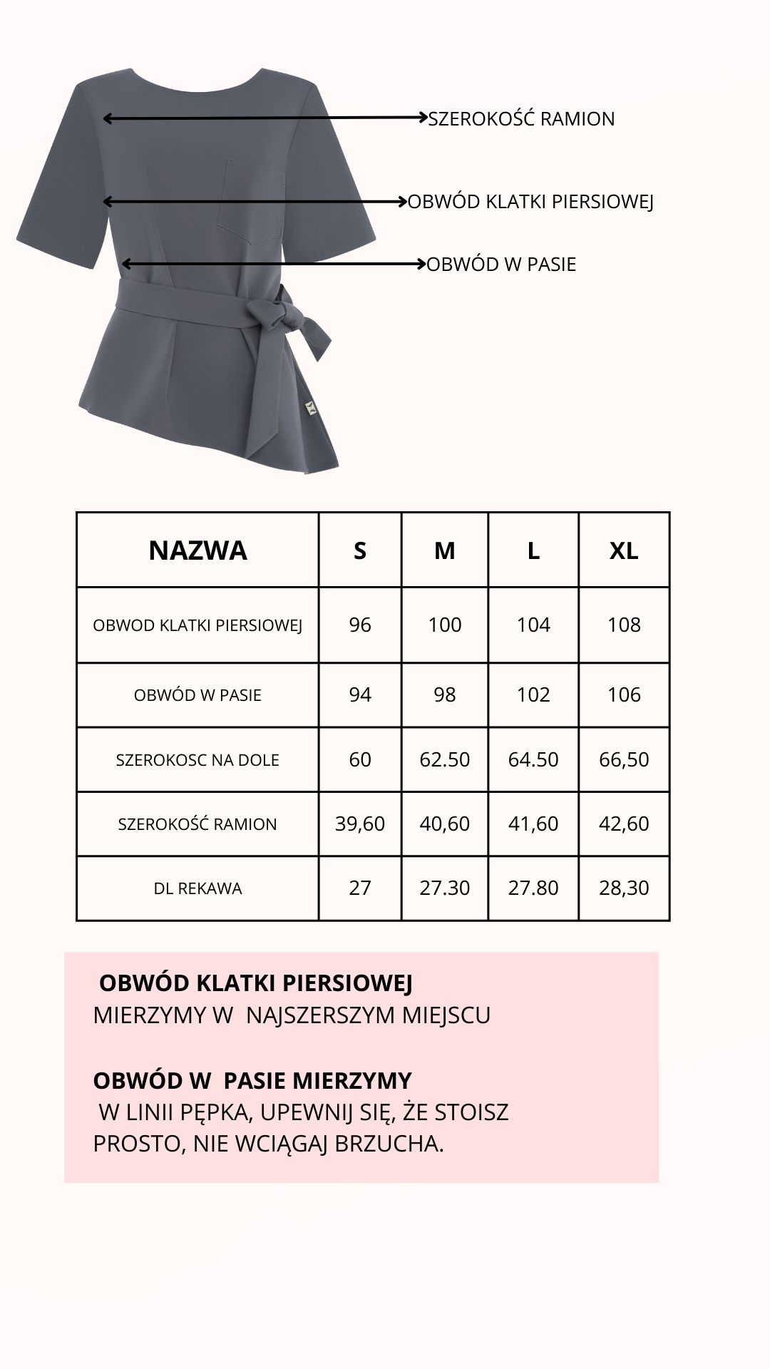 Bluzka EMANUEL wyróżnia się asymetrycznym cięciem oraz paskiem w talii, który subtelnie podkreśla sylwetkę i nadaje całości modnego, lekko biurowego charakteru.